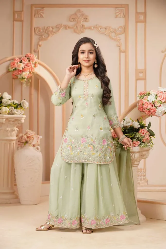 Pastel Mint Floral Embroidered Kurta Sharara Set
