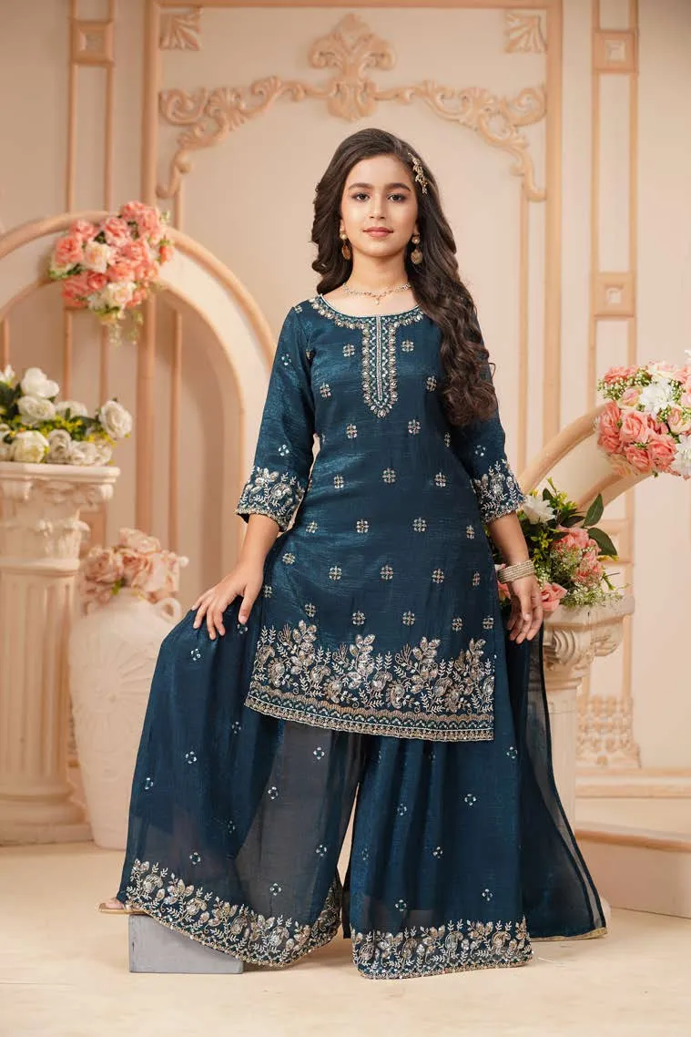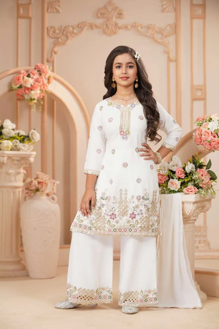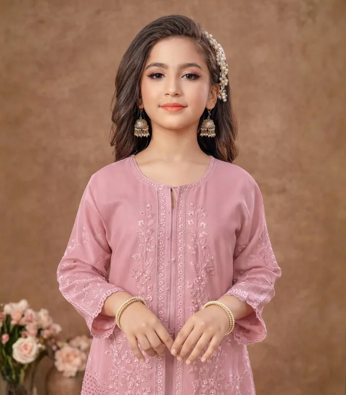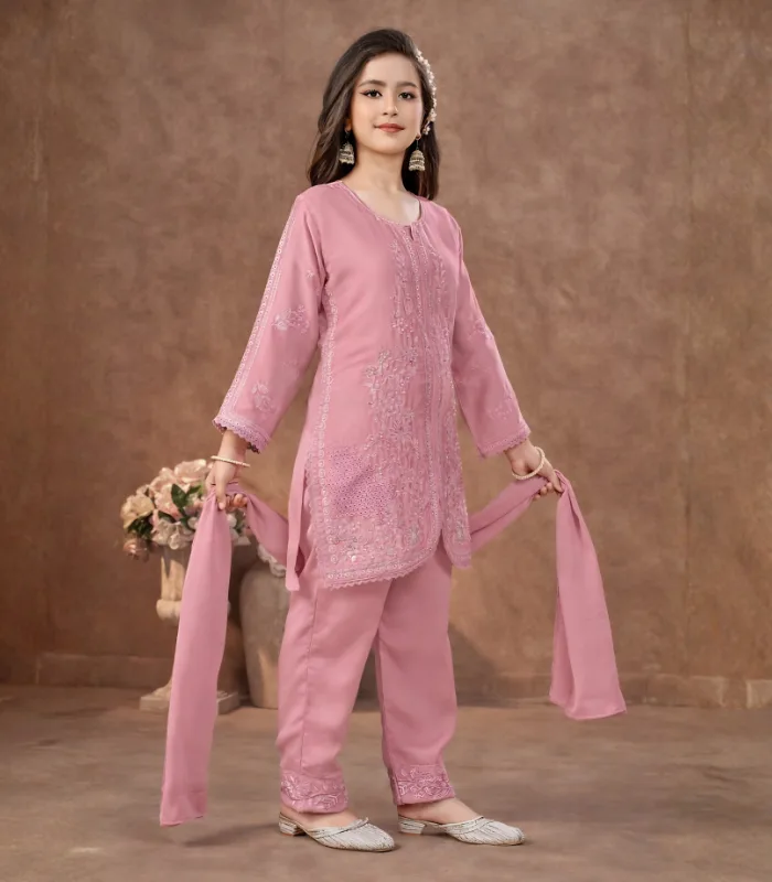 Charming blush pink kurta set with intricate thread embroidery, paired with tailored pants and a soft dupatta—perfect for festive elegance.