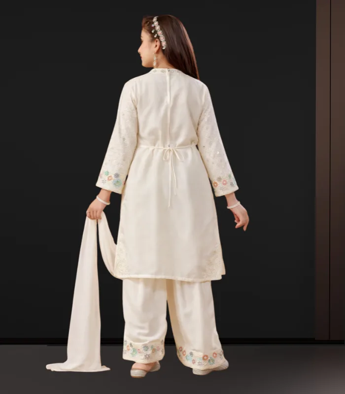 Elegant ivory kurta set with delicate pastel embroidery, paired with wide-leg palazzo pants and a soft dupatta—perfect for festive and semi-formal occasions.