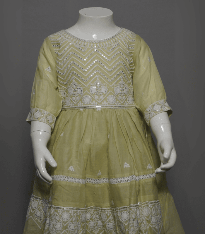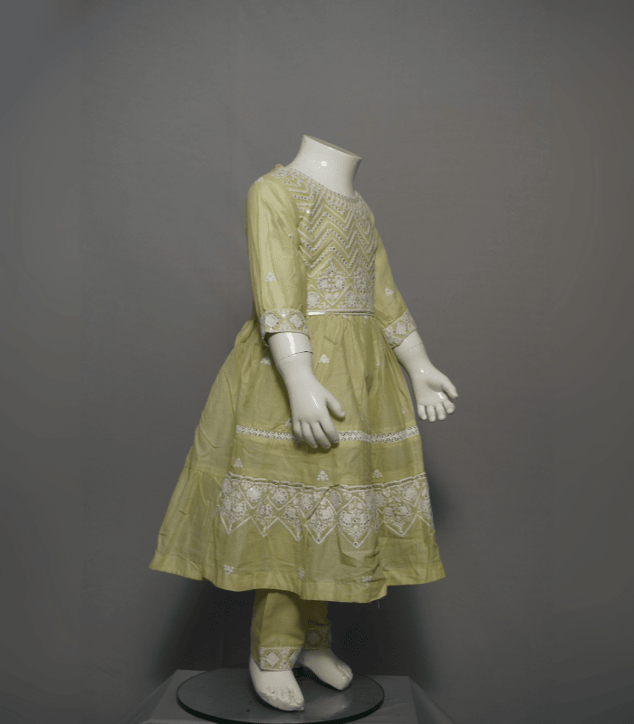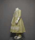 Bring home elegance with this charming Lemon Blossom Anarkali Set for little girls. Crafted in a soft pastel yellow shade, this outfit features intricate white chikankari-inspired embroidery on a flared Anarkali kurta paired with matching straight pants. The breathable fabric and delicate mirror details make it perfect for festive occasions, weddings, and family gatherings, keeping your child stylish yet comfortable all day long.