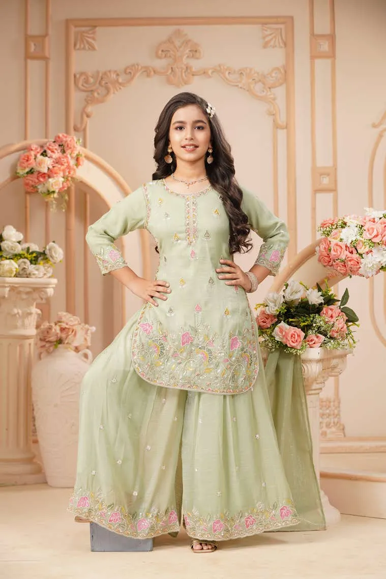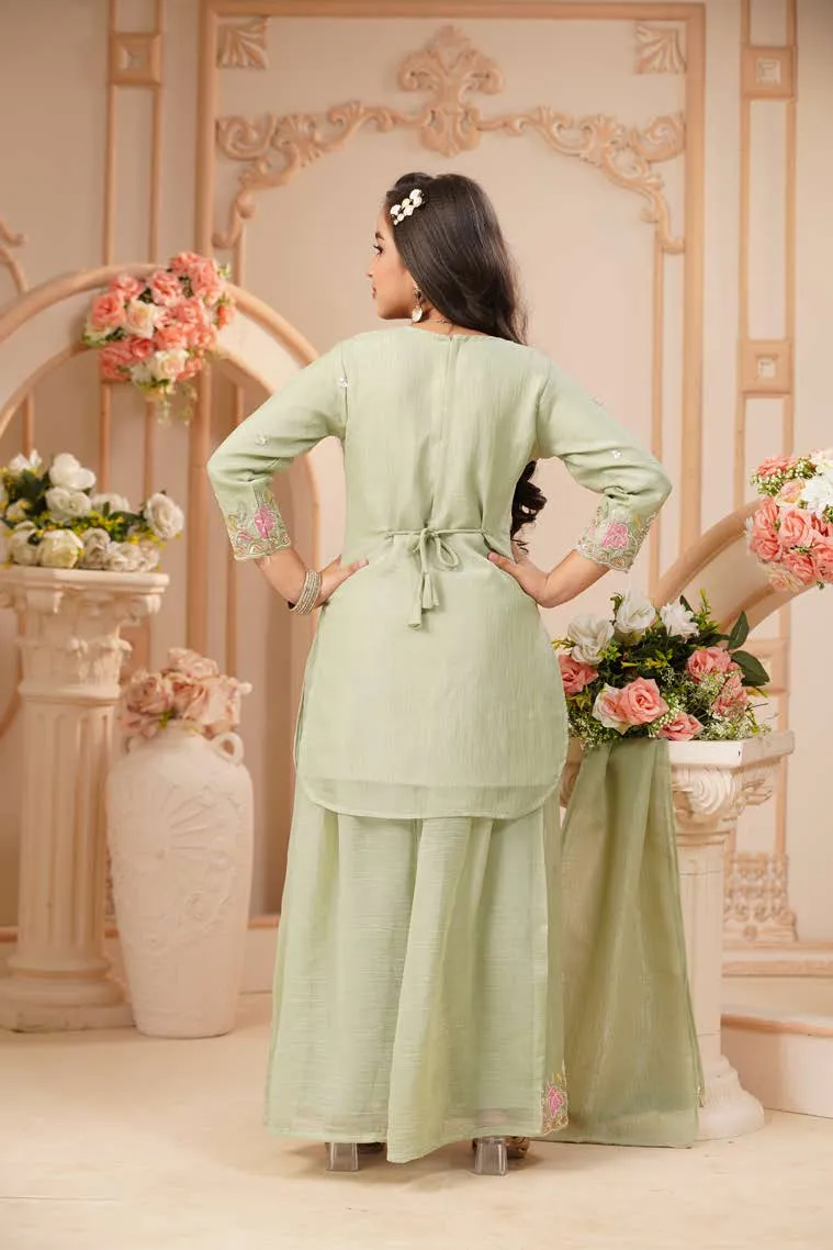 A refreshing pastel mint kurta sharara set with delicate floral embroidery, paired with a flowy sharara and matching dupatta—perfect for elegant festive wear.