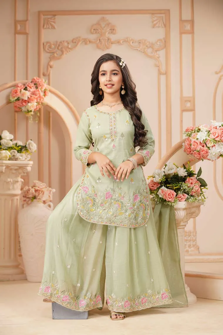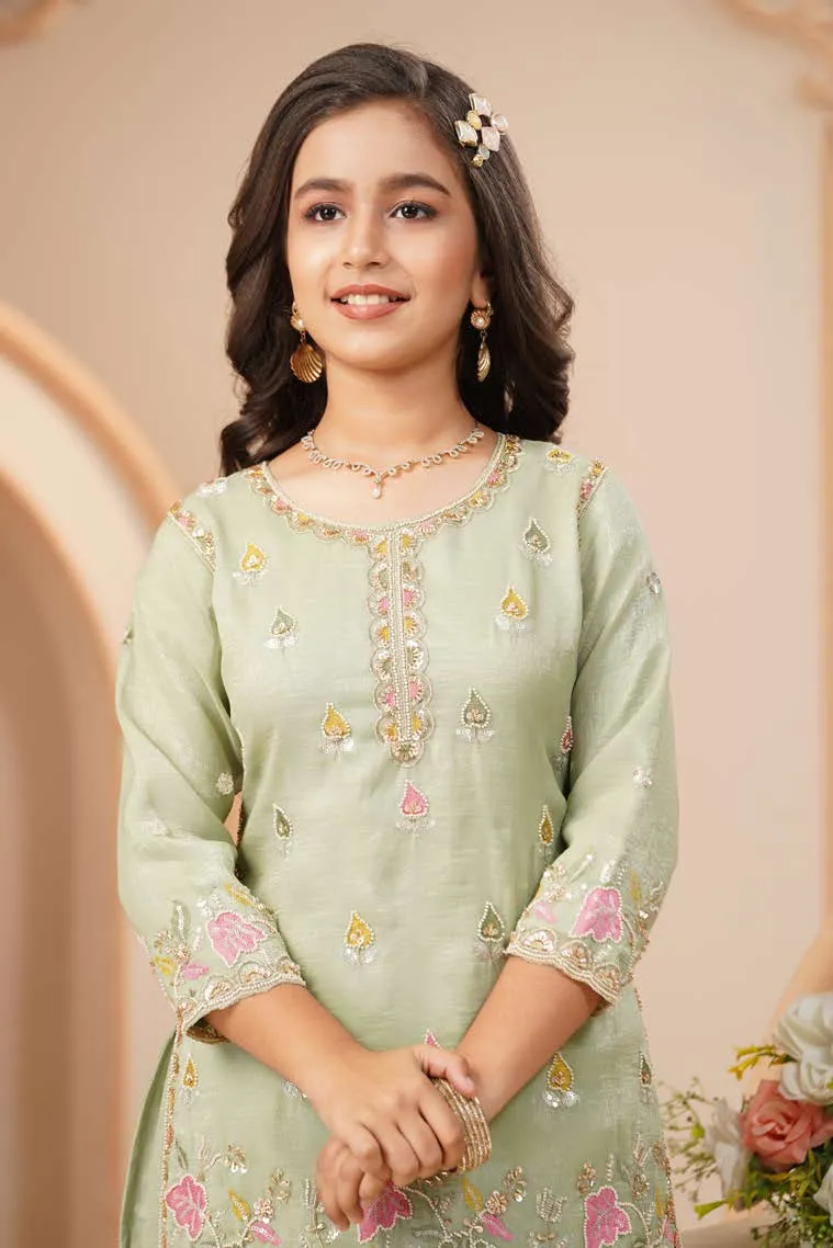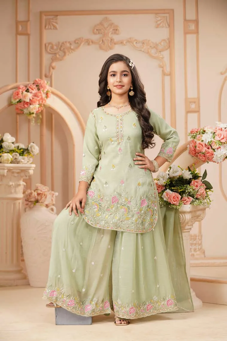 Pastel Mint Floral Embroidered Kurta Sharara Set