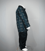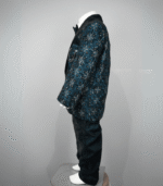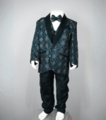 Dress your little gentleman in elegance with the Regal Midnight Tuxedo. This sophisticated suit set features a rich midnight blue fabric with an intricate geometric and floral pattern, giving it a royal and festive charm. The set includes a stylish blazer with velvet lapels, matching trousers, a patterned waistcoat, and a perfectly coordinated bow tie for a complete formal look. Ideal for weddings, parties, and special occasions, this outfit ensures your child stands out with grace and style.