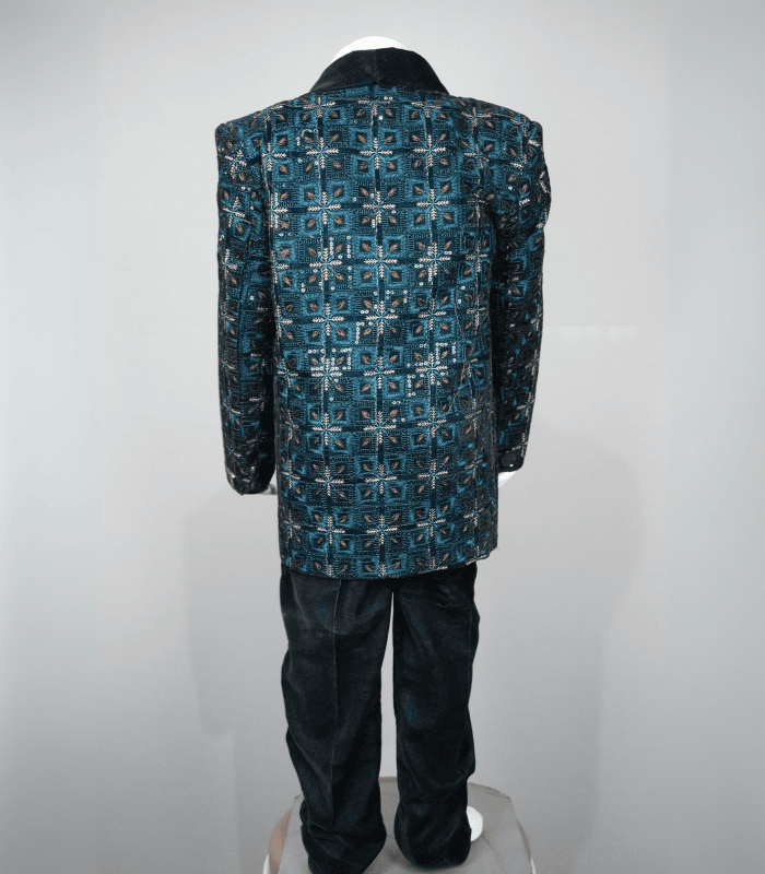 Dress your little gentleman in elegance with the Regal Midnight Tuxedo. This sophisticated suit set features a rich midnight blue fabric with an intricate geometric and floral pattern, giving it a royal and festive charm. The set includes a stylish blazer with velvet lapels, matching trousers, a patterned waistcoat, and a perfectly coordinated bow tie for a complete formal look. Ideal for weddings, parties, and special occasions, this outfit ensures your child stands out with grace and style.