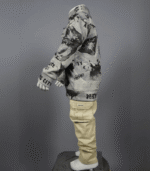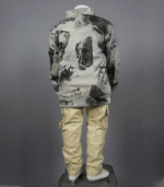 Printed Urban Jacket: A full-zip hoodie jacket with eye-catching black-and-white graphic prints, bold patches, and street-inspired lettering like “RIOT!” and “SAMCY.” Features flap chest pockets and a rugged texture for an edgy vibe.